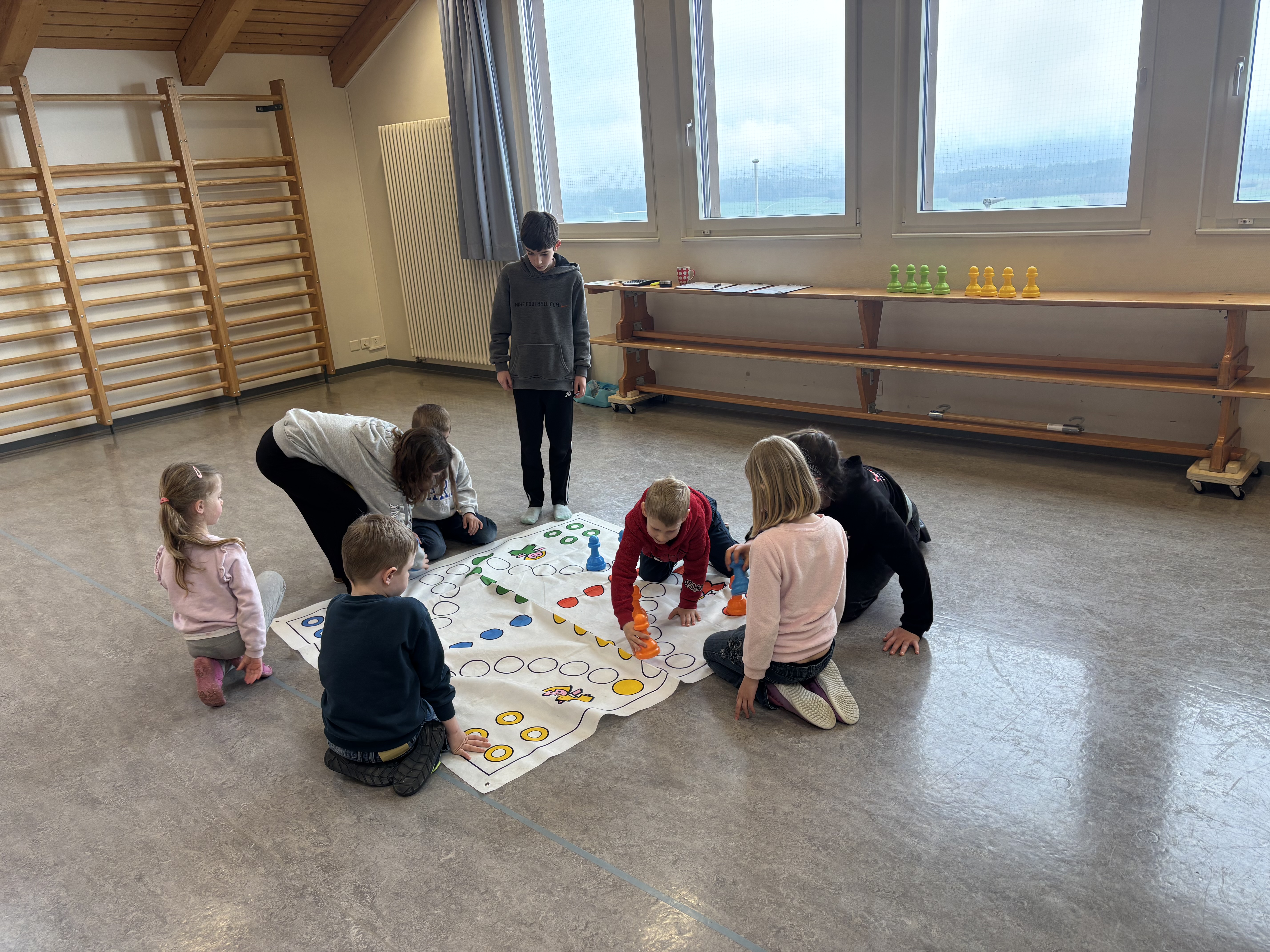 Am 1. April um 08:20 Uhr versammelten sich alle SchülerInnen und Kindergartenkinder vor dem Schulhaus und wurden in Gruppen eingeteilt. Als alle ihre Gruppe gefunden hatten, ging es auch schon los. Die Mission war klar. Chnorrlimorrli sucht ein Ersatzteam, falls Brazzo und Madame Miau aus unbekannten Gründen einmal ausfallen sollten. Nur die Besten der Besten kommen dafür in Frage. Bei XXL Eile mit Weile, Teamspielen, XXL Jenga, Geräuscheparcours, Fischen, Medaille basteln und Regeln besprechen war Geschicklichkeit, Schnelligkeit, Kreativität und gute Zusammenarbeit gefragt. Alle gaben ihr Bestes, damit die eigene Gruppe möglichst viele Punkte erzielte. Bei allem Ehrgeiz und Wettkampfgeist, kam aber auch der Spass nicht zu kurz. In der Pause und vor der Rangverkündigung wurde bei trockenem Wetter draussen gespielt. Das Warten auf die Resultate aus dem «Rechnungsbüro» stellte die Geduld Einzelner auf die Probe. Dann war endlich klar, welche Gruppe als Ersatzteam für Brazzo und Madame Miau einspringen könnte. Aber irgendwie haben doch auch alle gewonnen, denn Chnorrlimorrli hätte für die Suche nach einem Team sonst ja wohl kaum die Schule Kallern ausgewählt.