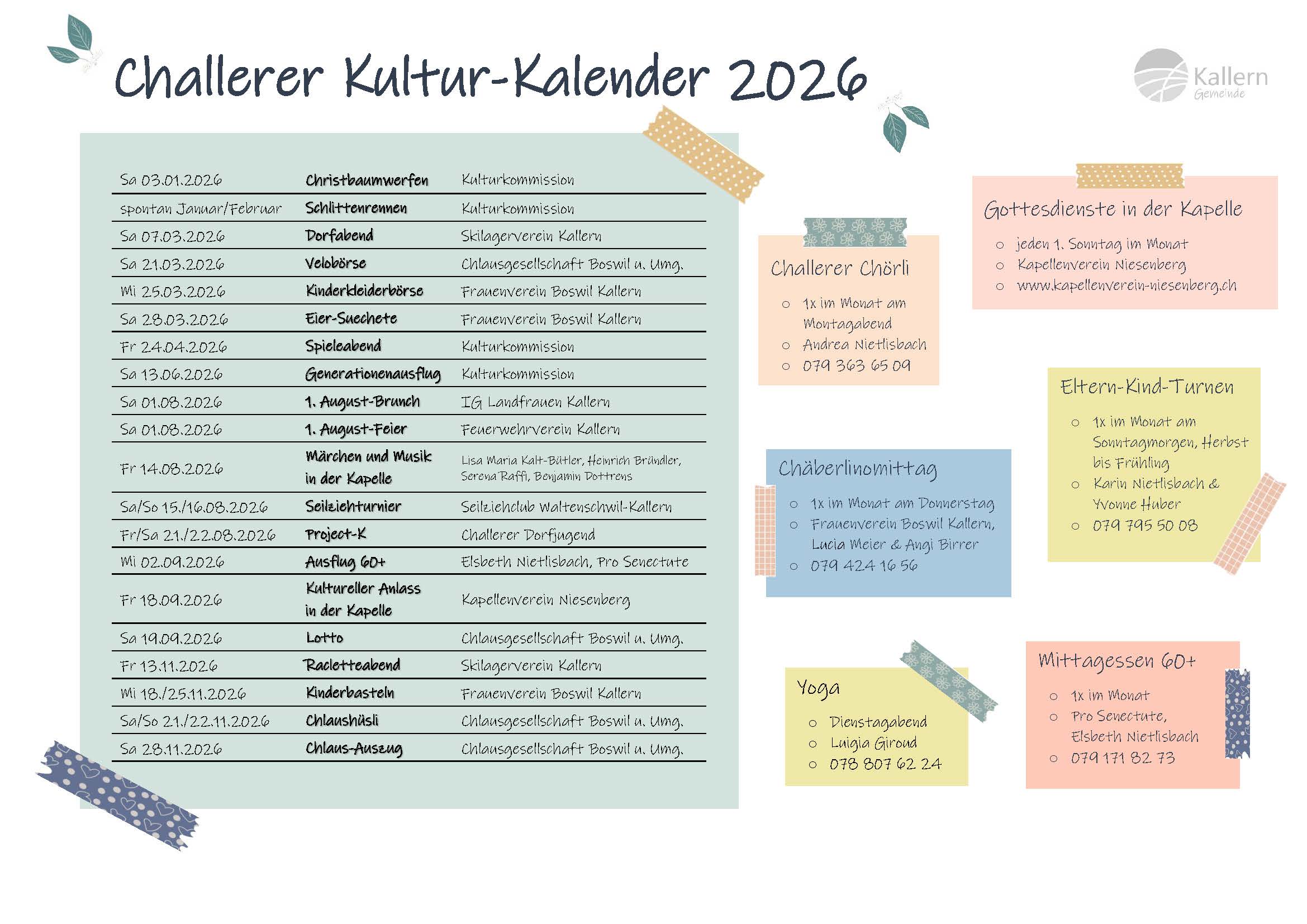 | Donnerstag | 11.12.2025 | Schule Kallern, Weihnachtsfeier mit Apéro und Singen um 18 Uhr |
